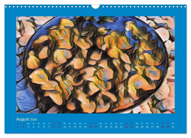 Abstrakte Kunstwerke bei denen man nicht immer auf Anhieb erkennen kann, was es darstellen soll. Das Spannende daran ist, dass bei längerem Betrachten bei jedem etwas anderes erkennbar sein wird. Mit viel Kreativität, hat die Fotografin und Designerin Marlies Gaudig, aus verschiedenen Themen, wie Natur, Tier, Landschaft und Dekorationen, Fotografien ausgewählt und diese mit Filtern in Photoshop zu Gemälden verwandelt. Jeder Monat ein Blickfang.