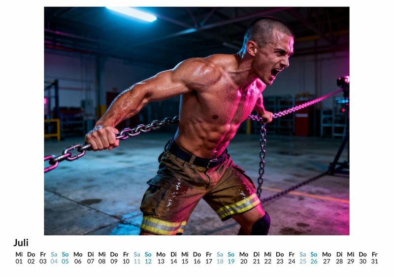Wenn die Flammen erlöschen und der Rauch sich lichtet, beginnt ein Moment der Stille. Der Kalender "Heiße Feuerwehrmänner" fängt genau diese Augenblicke ein. Er zeigt Männer, die sich dem Feuer gestellt haben, gezeichnet von ihrem Einsatz. Dieser Kalender ist eine passende Wahl: * Für alle, die eine Vorliebe für durchtrainierte Körper und kraftvolle Darstellungen haben. * Als Geschenkidee für besondere Anlässe, die in Erinnerung bleiben soll. * Für Bewunderer des Mutes und der Stärke, die der Beruf des Feuerwehrmannes symbolisiert. Zwölf Monate, zwölf Szenarien. Jeder Monat präsentiert einen Feuerwehrmann nach getaner Arbeit. Die Haut glänzt von Schweiß, Rußspuren zeichnen die Konturen der Muskeln nach. Nur mit Feuerwehrhose und Stiefeln bekleidet, strahlen die Männer eine konzentrierte Ruhe aus. Diese detailreichen Szenen wurden durch komplexe Rechenprozesse erschaffen, um eine ganz eigene Bildsprache zu entwickeln. Beim Kauf dieses Kalenders kann Folgendes erwartet werden: * Ein Wandkalender für das gesamte Jahr. * Zwölf abwechslungsreiche Monatsmotive. * Ein klares Kalendarium für die persönliche Organisation. Der Kalender verbindet die raue Welt der Brandbekämpfung mit einer durchdachten Ästhetik. Eine Sammlung von Bildern, die Stärke und Entschlossenheit zeigen. Es ist an der Zeit, die einzelnen Monatsblätter zu entdecken und sich selbst ein Bild von dieser besonderen Zusammenstellung zu machen.