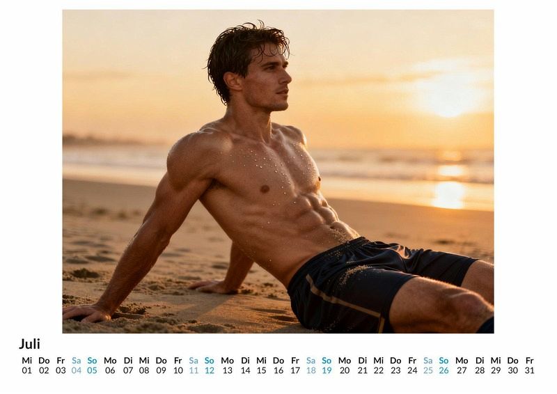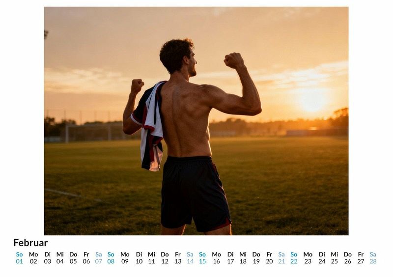 Der Schlusspfiff ertönt und die Anspannung auf dem Spielfeld weicht der Erschöpfung. In diesen Momenten, wenn das Trikot nach einem hart umkämpften Match getauscht wird, zeigt sich die pure Athletik der Sportler. Der Kalender "Heiße Fußballspieler" fängt genau diese Szenen ein und begleitet mit zwölf Motiven durch das gesamte Jahr. Dieser Kalender ist eine passende Wahl: Für alle, die die Ästhetik durchtrainierter Sportlerkörper schätzen. Als Geschenk für Fußballbegeisterte mit einem Auge für Details. Für die Dekoration von Räumen, die einen sportlichen Akzent erhalten sollen. Jeder Monat präsentiert einen Athleten in einem Moment der Ruhe nach dem Kampf. Die Körper sind vom Spiel gezeichnet, verschwitzt und zeigen definierte Muskeln sowie sichtbare Anstrengung. Der Fokus liegt auf dem Augenblick des Tauschs, bei dem der Oberkörper entblößt wird und das Sixpack zum Vorschein kommt. Jedes Bild ist das Ergebnis einer fortschrittlichen computergestützten Kreation und zeigt die Spieler nur in ihren Shorts, wie sie nach dem Spiel innehalten. Was der Kalender bietet: 12 Monatsmotive mit athletischen Fußballspielern. Ein Wandkalender mit praktischem Kalendarium für das ganze Jahr. Darstellungen, die den Moment nach dem Spiel festhalten. Zusammenfassend bietet der Kalender "Heiße Fußballspieler" eine Sammlung von Momentaufnahmen, die die körperliche Anstrengung und die Ästhetik des Fußballsports vereinen. Er konzentriert sich vollständig auf die kraftvollen Augenblicke nach dem Abpfiff, die sonst verborgen bleiben. Eine Entdeckungsreise durch zwölf Monate voller sportlicher Energie und kraftvoller Körperlichkeit erwartet den Betrachter.