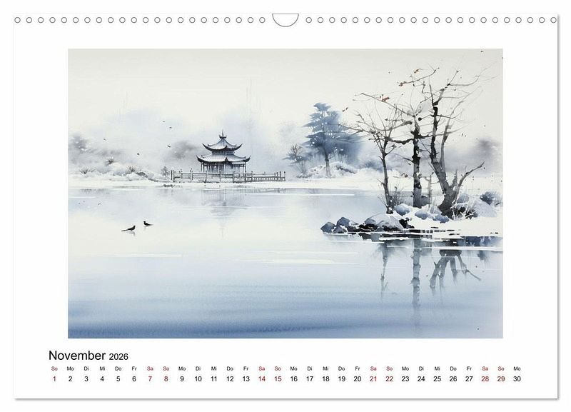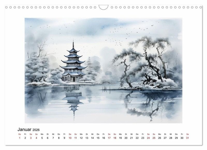 Die Bilder im Aquarellstil in diesem Kalender entführen Sie in eine friedliche Welt der japanischen Landschaften, Bambuswälder, Pagoden, stille Seen. Jeder Monat zeigt eine neue Szene, die von der künstlichen Intelligenz mit Liebe zum Detail erstellt wurde.