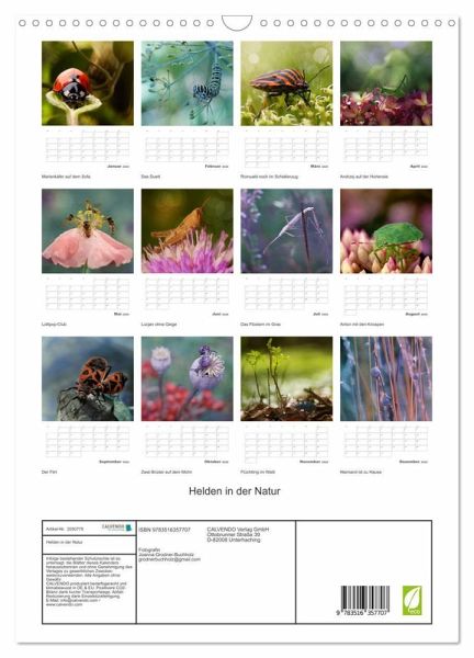 In diesem Kalender finden Sie die kleinen Lebewesen, die neben Ihnen im Wald, auf der Wiese oder im Garten leben. Aufgenommen mit den Augen der Fotografin Grodner-Buchholz, die jeden Tag mit Begeisterung die kleinen Helden beobachtet. Die ganze Schönheit der Natur in einem Kalender für alle, die die Natur und Makrofotografie lieben.