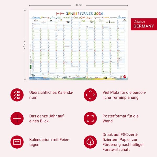 - Schöner planen mit Johnny Mauser, Franz von Hahn und dem dicken Waldemar: Das Jahresplaner-Poster für Helme-Heine-Fans- Zwölf Monate zeitgleich im Blick mit dem großen Wandkalender 2026 zum Eintragen- Entspannter Planen mit Schwein, Maus und Hahn und Figuren aus Mullewapp: Kalender mit liebevollen Illustrationen des bekannten Künstlers- Organisation im Großformat: Der Posterplaner im Format 68 x 48 cm- Ein ganzes Jahr lang den Überblick bewahren: Posterkalender von Heye aus dem Athesia Kalenderverlag