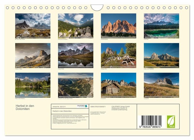 Die unbestrittene Schönheit der Dolomiten fasziniert jeden, der einmal dort seine Ferien verbringen konnte. Mit diesem wunderschönen Kalender holen sie sich die herbstliche Stimmung Südtirols zu Ihnen nach Hause.
