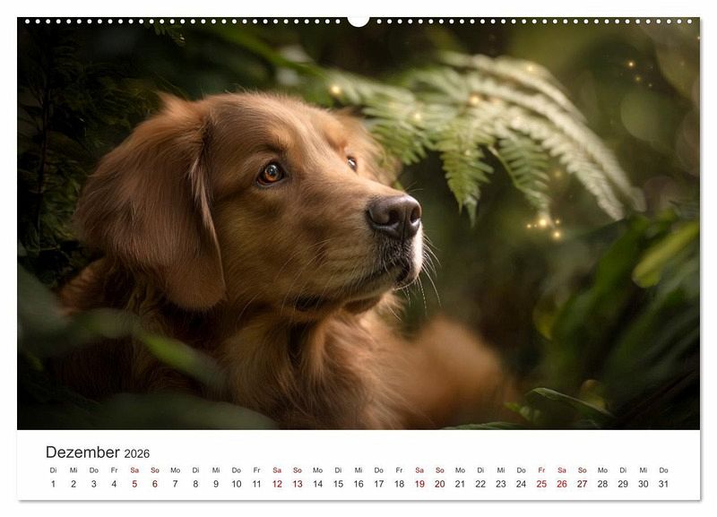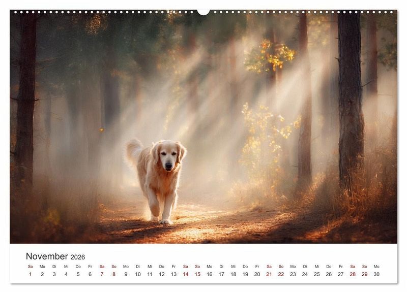 Ein stilvoller, KI - generierter Wandkalender mit atmosphärischen Bildern und feinsinnigen Bildunterschriften. Er zeigt den Golden Retriever nicht nur als treuen Begleiter, sondern als Persönlichkeit: lebensklug, anmutig, manchmal verschmitzt.