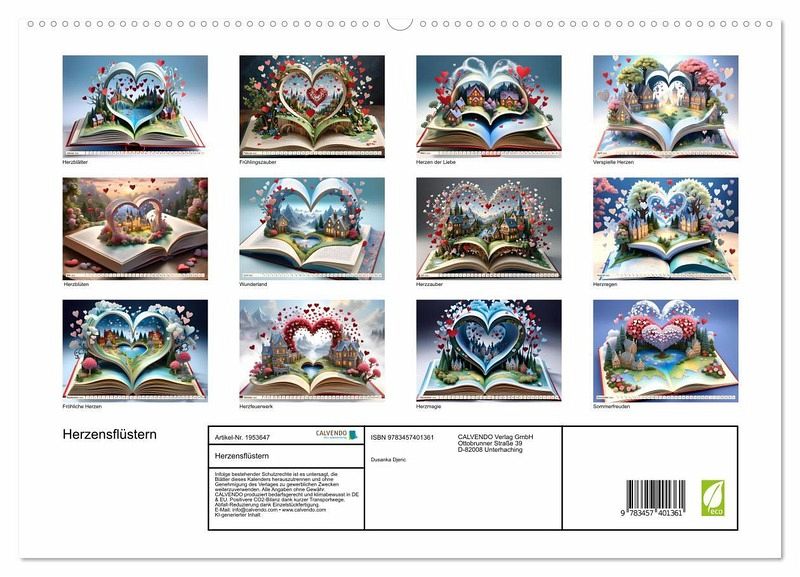 Lassen Sie sich jeden Monat aufs Neue von der Schönheit und Magie der Herzen und Natur verzaubern, die aus den Seiten eines Buches entspringt. Dieser Kalender ist nicht nur ein Zeitmesser, sondern ein Portal in eine Welt, in der die Grenzen zwischen Realität und Fantasie verschwimmen.