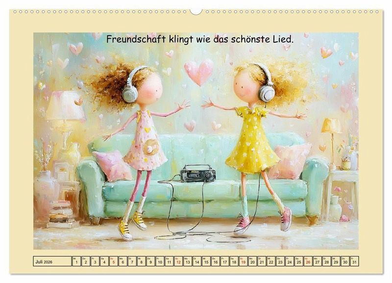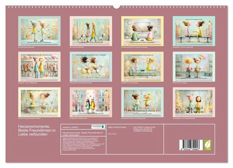 Dieser Kalender zeigt die wundervolle Freundschaft zweier Mädchen, die gemeinsam ein Jahr voller magischer Alltagsmomente erleben. Jede Illustration erzählt eine kleine Geschichte über Zusammenhalt, Spaß und kindliche Neugier. Die mit der Hilfe von KI erstelletn Bilder verbinden zarte Farben, liebevolle Details und einen charmanten, mädchenhaften Zeichenstil. Entstanden ist ein lieblicher Jahresbegleiter, der Herzen wärmt und zum Träumen einlädt.