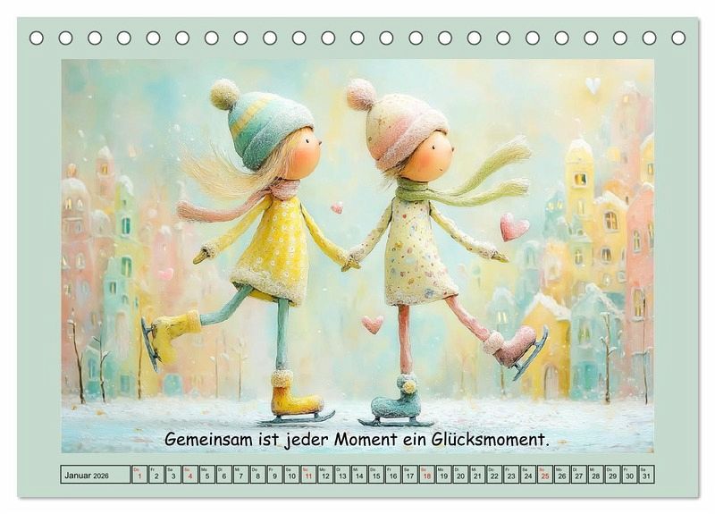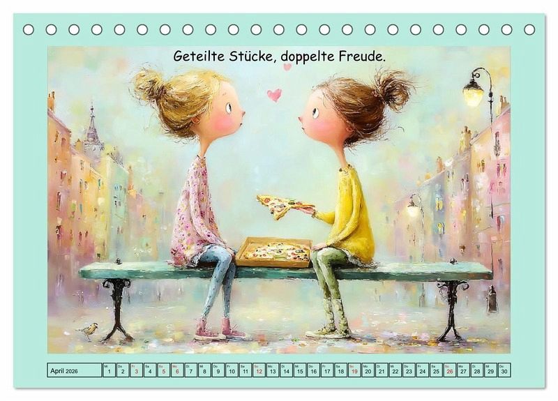 Dieser Kalender zeigt die wundervolle Freundschaft zweier Mädchen, die gemeinsam ein Jahr voller magischer Alltagsmomente erleben. Jede Illustration erzählt eine kleine Geschichte über Zusammenhalt, Spaß und kindliche Neugier. Die mit der Hilfe von KI erstelletn Bilder verbinden zarte Farben, liebevolle Details und einen charmanten, mädchenhaften Zeichenstil. Entstanden ist ein lieblicher Jahresbegleiter, der Herzen wärmt und zum Träumen einlädt.