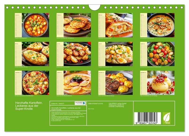 QUALITÄT - Hochwertiger Fotokalender mit 12 wunderschönen Motiven auf lichtbeständigem Bilderdruckpapier, robuste Spiralbindung mit Aufhängebügel.NACHHALTIG - deutliche Abfallreduzierung durch bedarfsgerechte Einzelstückfertigung, umweltfreundliches FSC-zertifiziertes Papier, Produktion in Deutschland, klimabewusste Logistik.PERFEKTES GESCHENK - Kalender für Freunde und Familie, für Kinder und Erwachsene, jung und alt, zu Weihnachten, Geburtstag oder zwischendurch.VIELFALT - Bildkalender in verschiedenen Formaten, z.B. DIN A5, DIN A4, DIN A3 sowie DIN A2. Ob Naturmotiv, Gemälde oder Fotos, ideal für ein persönliches Wohlfühlambiente.Schöne Illustrationen von köstlichen Kartoffelgerichten von Autor(in): Rose Hurley