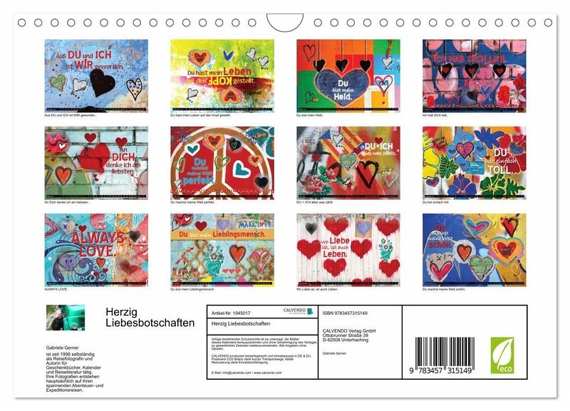 Entdecken Sie den HERZIG Liebesbotschaften Kalender - Ihr täglicher Begleiter voller Liebe und Herzenswärme! Jeder Monat überrascht mit coolen und charmanten Illustrationen und liebevollen Botschaften, die das Herz berühren und zum Lächeln bringen. Egal, ob Sie frisch verliebt sind oder die Liebe schon lange feiern - dieser Kalender erinnert daran, wie wertvoll Ihre Beziehung ist. Lassen Sie sich von herzigen Ideen inspirieren und versüßen Sie Ihrem Lieblingsmenschen den Alltag. Der perfekte Mix aus Zuneigung und Kreativität - ein Geschenk, das 365 Tage lang Freude schenkt! HERZIG Liebesbotschaften: Liebe jeden Tag! Die verwendeten Herzen hat Gabriele Gerner auf vielen Reisen um den ganzen Globus gesammelt und mit modernen Hintergründen tolle Collagen erstellt.