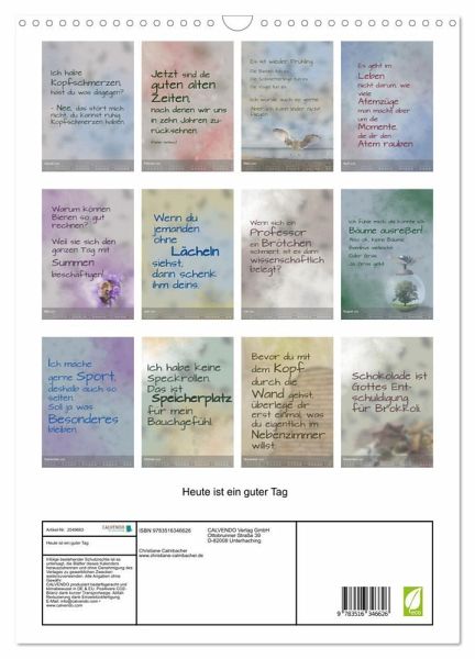QUALITÄT - Hochwertiger Fotokalender mit 12 wunderschönen Motiven auf lichtbeständigem Bilderdruckpapier, robuste Spiralbindung mit Aufhängebügel.NACHHALTIG - deutliche Abfallreduzierung durch bedarfsgerechte Einzelstückfertigung, umweltfreundliches FSC-zertifiziertes Papier, Produktion in Deutschland, klimabewusste Logistik.PERFEKTES GESCHENK - Kalender für Freunde und Familie, für Kinder und Erwachsene, jung und alt, zu Weihnachten, Geburtstag oder zwischendurch.VIELFALT - Bildkalender in verschiedenen Formaten, z.B. DIN A5, DIN A4, DIN A3 sowie DIN A2. Ob Naturmotiv, Gemälde oder Fotos, ideal für ein persönliches Wohlfühlambiente.Positive Sprüche für gute Laune von Autor(in): Christiane Calmbacher