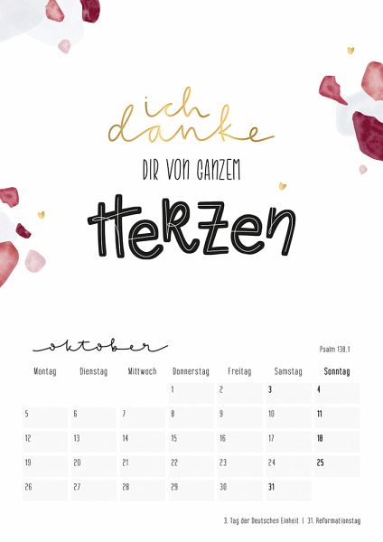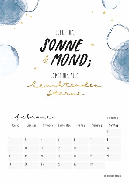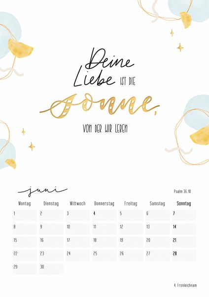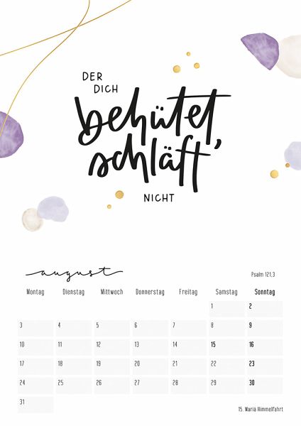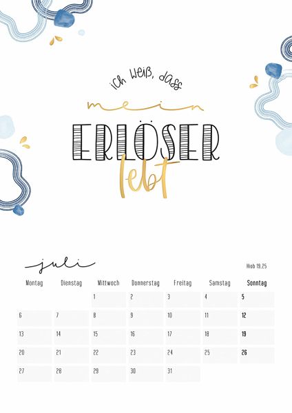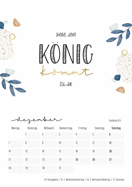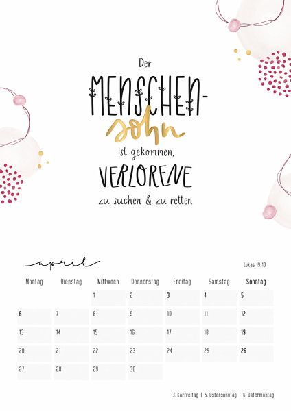 Auch für 2026 gibt es wieder den außergewöhnlichen Kalender "Himmelsglück" - ein wunderschönes Geschenk! Jede Seite des Kalenders zieren handgezeichnete Aquarellmotive, kombiniert mit ausgewählten Bibelversen in kunstvollem Handlettering. Die hochwertige Klammerbindung zum Aufhängen verleiht dem Kalender nicht nur Stabilität, sondern auch einen charmanten Look. Verpackt in einer durchsichtigen Folie, bleibt das Design sichtbar und macht neugierig auf den Inhalt. Ideal als liebevolle Aufmerksamkeit für jeden Anlass - dieser Kalender begleitet und ermutigt jeden Tag des Jahres.