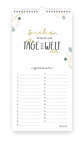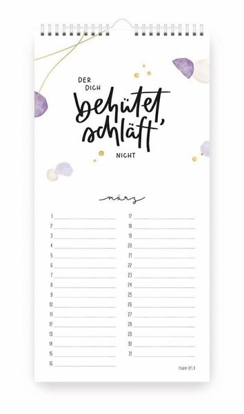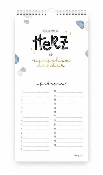 Dieser neue Geburtstagskalender verbindet 12 Bibelverse aus den Himmelsglück-Kalendern mit einem immerwährenden Kalendarium für Geburtstage. Jede Seite des Kalenders zieren handgezeichnete Aquarellmotive, kombiniert mit ausgewählten Bibelversen in kunstvollem Handlettering.