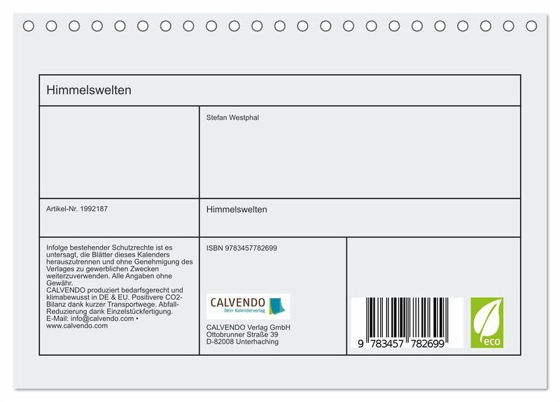 QUALITÄT - Hochwertiger Fotokalender mit 12 wunderschönen Motiven auf lichtbeständigem Bilderdruckpapier, robuste Spiralbindung.NACHHALTIG - deutliche Abfallreduzierung durch bedarfsgerechte Einzelstückfertigung, umweltfreundliches FSC-zertifiziertes Papier, Produktion in Deutschland, klimabewusste Logistik.PERFEKTES GESCHENK - Kalender für Freunde und Familie, für Kinder und Erwachsene, jung und alt, zu Weihnachten, Geburtstag oder zwischendurch.VIELFALT - Bildkalender in verschiedenen Formaten, z.B. DIN A5, DIN A4, DIN A3 sowie DIN A2. Ob Naturmotiv, Gemälde oder Fotos, ideal für ein persönliches Wohlfühlambiente.Wunderschöne Himmelsphänomene unseres Weltalls von Autor(in): Stefan Westphal