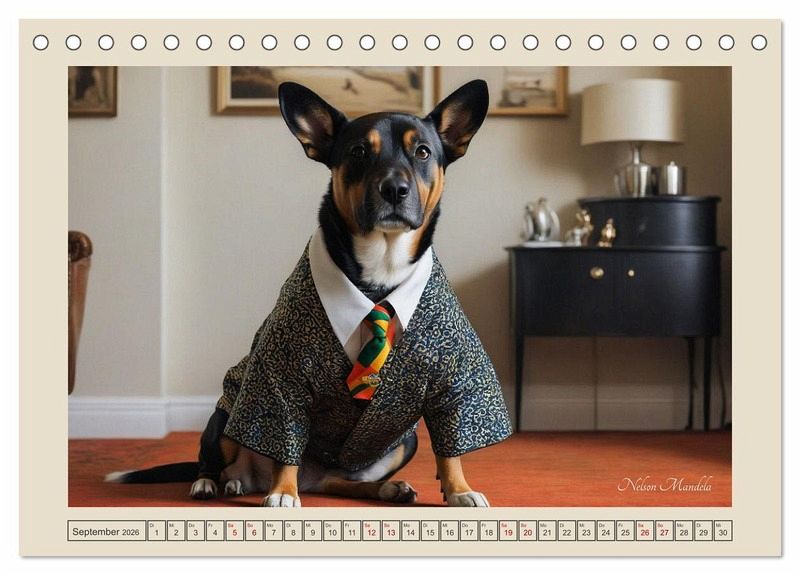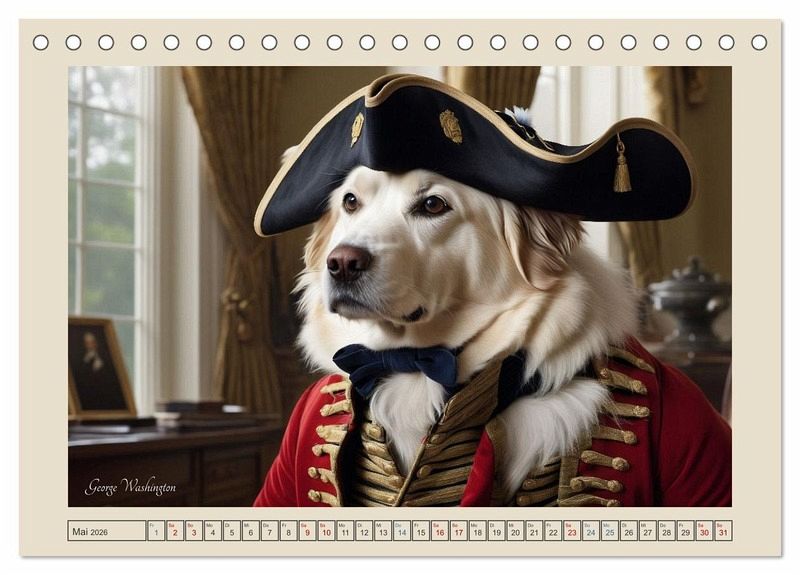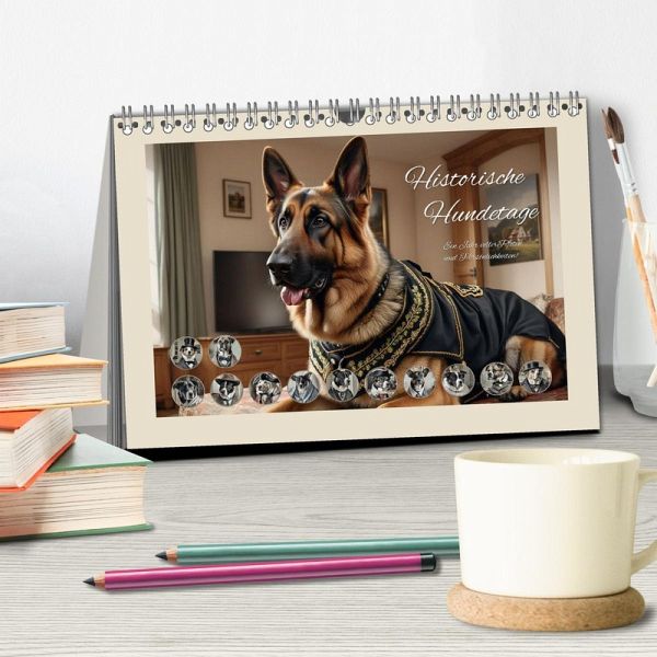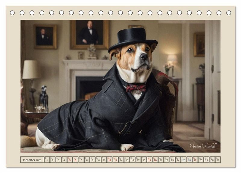 Der Kalender "Historische Hundetage" präsentiert eine humorvolle und kreative Kollektion von KI-generierten Bildern, die Hunde in der Kleidung berühmter historischer Persönlichkeiten zeigen. Jeder Monat enthüllt ein einzigartiges Porträt, das die Essenz von Legenden wie Winston Churchill, Queen Victoria oder Mahatma Gandhi einfängt - allesamt mit einem Augenzwinkern dargestellt. Diese originellen Illustrationen verbinden Tierliebe mit einem Hauch von Geschichte, perfekt für Liebhaber von Hunden und historischer Kunst gleichermaßen. Ein ideales Geschenk, das Witz und Kultur vereint!