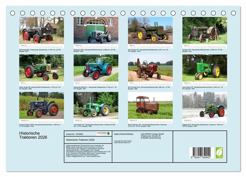 Dieser ansprechende Kalender zeigt stimmungsvolle Aufnahmen seltener und teils ungewöhnlicher historischer Traktoren. Diese klassischen Schlepper gehören zur Sammlung von Hendrik Deters, der auch selbst die Motive sorgfältig arrangierte und aufnahm.