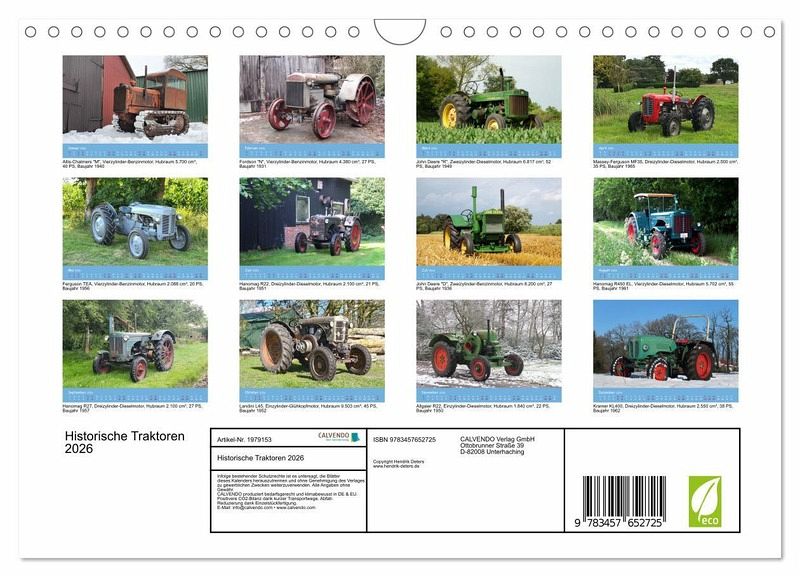 Dieser ansprechende Kalender zeigt stimmungsvolle Aufnahmen seltener und teils ungewöhnlicher historischer Traktoren. Diese klassischen Schlepper gehören zur Sammlung von Hendrik Deters, der auch selbst die Motive sorgfältig arrangierte und aufnahm.