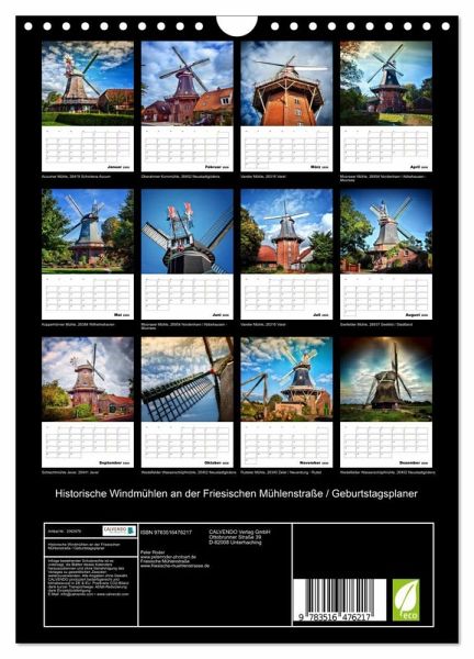 QUALITÄT - Hochwertiger Fotokalender mit 12 wunderschönen Motiven auf lichtbeständigem Bilderdruckpapier, robuste Spiralbindung mit Aufhängebügel.NACHHALTIG - deutliche Abfallreduzierung durch bedarfsgerechte Einzelstückfertigung, umweltfreundliches FSC-zertifiziertes Papier, Produktion in Deutschland, klimabewusste Logistik.PERFEKTES GESCHENK - Kalender für Freunde und Familie, für Kinder und Erwachsene, jung und alt, zu Weihnachten, Geburtstag oder zwischendurch.VIELFALT - Bildkalender in verschiedenen Formaten, z.B. DIN A5, DIN A4, DIN A3 sowie DIN A2. Ob Naturmotiv, Gemälde oder Fotos, ideal für ein persönliches Wohlfühlambiente.Peter Roder präsentiert eine Auswahl seiner faszinierenden Bilder der Mühlen an der Friesischen Mühlenstraße. von Autor(in): Peter Roder