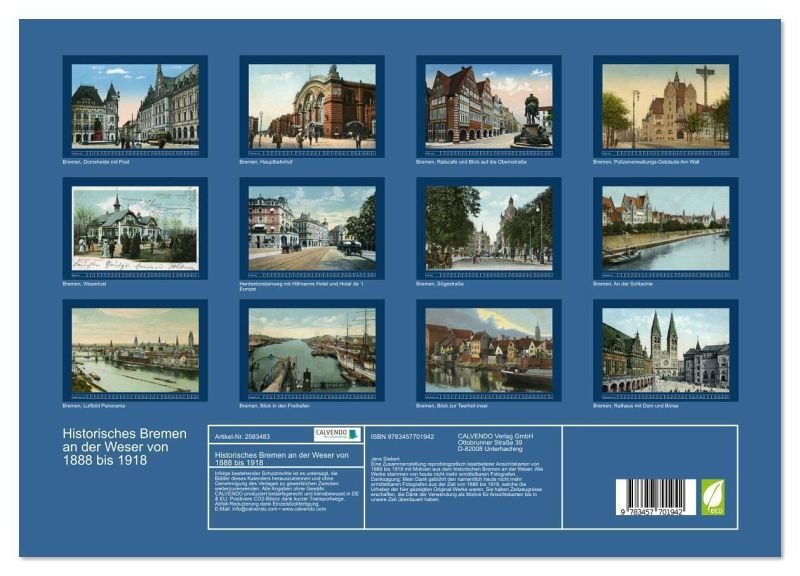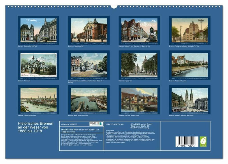 PREMIUM-LINIE - Brillanter Fotokalender mit 12 wunderschönen Motiven, Kunstdruck in Hochglanz in Museumsqualität.QUALITÄT - edle Materialien, stabile Rückwand mit 2 innovativen Einstecktaschen für eine optimale Präsentation an der Wand.NACHHALTIG - deutliche Abfallreduzierung durch bedarfsgerechte Einzelstückfertigung, umweltfreundliches FSC-zertifiziertes Papier, Produktion in Deutschland, klimabewusste Logistik.PERFEKTES GESCHENK - Kalender für Freunde und Familie, für Kinder und Erwachsene, jung und alt, zu Weihnachten, Geburtstag oder zwischendurch.Ein Kalender mit Motiven von historischen Ansichtskarten aus der Hansestadt Bremen an der Weser. von Autor(in): Jens Siebert