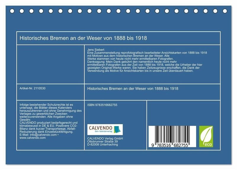 QUALITÄT - Hochwertiger Fotokalender mit 12 wunderschönen Motiven auf lichtbeständigem Bilderdruckpapier, robuste Spiralbindung.NACHHALTIG - deutliche Abfallreduzierung durch bedarfsgerechte Einzelstückfertigung, umweltfreundliches FSC-zertifiziertes Papier, Produktion in Deutschland, klimabewusste Logistik.PERFEKTES GESCHENK - Kalender für Freunde und Familie, für Kinder und Erwachsene, jung und alt, zu Weihnachten, Geburtstag oder zwischendurch.VIELFALT - Bildkalender in verschiedenen Formaten, z.B. DINA5, DIN A4, DIN A3 sowie DIN A2. Ob Naturmotiv, Gemälde oder Fotos, ideal für ein persönliches Wohlfühlambiente.Ein Kalender mit Motiven von historischen Ansichtskarten aus der Hansestadt Bremen an der Weser. von Autor(in): Jens Siebert