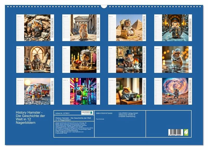 QUALITÄT - Hochwertiger Fotokalender mit 12 wunderschönen Motiven auf lichtbeständigem Bilderdruckpapier, robuste Spiralbindung mit Aufhängebügel.NACHHALTIG - deutliche Abfallreduzierung durch bedarfsgerechte Einzelstückfertigung, umweltfreundliches FSC-zertifiziertes Papier, Produktion in Deutschland, klimabewusste Logistik.PERFEKTES GESCHENK - Kalender für Freunde und Familie, für Kinder und Erwachsene, jung und alt, zu Weihnachten, Geburtstag oder zwischendurch.VIELFALT - Bildkalender in verschiedenen Formaten, z.B. DIN A5, DIN A4, DIN A3 sowie DIN A2. Ob Naturmotiv, Gemälde oder Fotos, ideal für ein persönliches Wohlfühlambiente.Ein Hamster reist durch die Epochen von Autor(in): Michaela Spreider