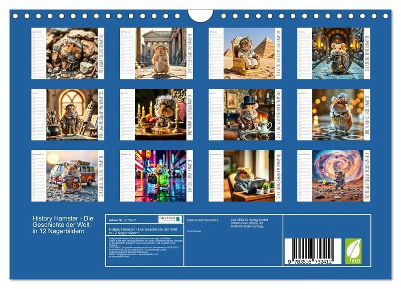 QUALITÄT - Hochwertiger Fotokalender mit 12 wunderschönen Motiven auf lichtbeständigem Bilderdruckpapier, robuste Spiralbindung mit Aufhängebügel.NACHHALTIG - deutliche Abfallreduzierung durch bedarfsgerechte Einzelstückfertigung, umweltfreundliches FSC-zertifiziertes Papier, Produktion in Deutschland, klimabewusste Logistik.PERFEKTES GESCHENK - Kalender für Freunde und Familie, für Kinder und Erwachsene, jung und alt, zu Weihnachten, Geburtstag oder zwischendurch.VIELFALT - Bildkalender in verschiedenen Formaten, z.B. DIN A5, DIN A4, DIN A3 sowie DIN A2. Ob Naturmotiv, Gemälde oder Fotos, ideal für ein persönliches Wohlfühlambiente.Ein Hamster reist durch die Epochen von Autor(in): Michaela Spreider