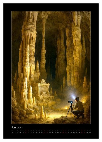 Mit Hilfe von KI gestaltete Bildwelten führen tief unter die Erde - dorthin, wo Licht auf Stein trifft und Stille Form annimmt. Riesige Tropfsteinhallen, glitzernde Kristalle und einsame Forscher begegnen sich in Szenen voller Ehrfurcht. Jede Aufnahme erzählt von verborgener Schönheit und dem Staunen des Menschen im Angesicht der Tiefe. Eine Hommage an das Unsichtbare - kraftvoll, klar und zeitlos.