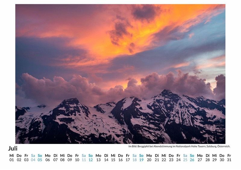 Entdecken Sie die majestätische Schönheit der Hohen Tauern in Ihrem Zuhause! Unser hochwertiger Wandkalender entführt Sie Monat für Monat in die atemberaubende Bergwelt Österreichs. Genießen Sie 12 sorgfältig ausgewählte Motive, die die unberührte Natur und beeindruckenden Gipfel dieser einzigartigen Region perfekt einfangen. Gedruckt auf lichtbeständigem Bilderdruckpapier, bleiben die Farben lebendig und strahlend. Nachhaltigkeit liegt uns am Herzen: Der Kalender wird in Deutschland auf FSC-zertifiziertem Papier produziert. Holen Sie sich ein Stück Alpenzauber an Ihre Wand - ideal auch als Geschenk für Naturliebhaber! Jetzt bestellen und das ganze Jahr über inspirieren lassen! Hochwertig Erleben Sie ein Jahr voller Eleganz mit unserem Premium-Fotokalender. Jedes der 12 Motive ist auf hochwertigem, lichtbeständigem Bilderdruckpapier gedruckt, um die Lebendigkeit jedes Bildes zu bewahren. Die robuste Spiralbindung gewährleistet Langlebigkeit und einfache Handhabung. Nachhaltig Unser Engagement für die Umwelt spiegelt sich in jedem Exemplar wider. Durch die Produktion auf Abruf reduzieren wir signifikant unseren Abfall. Wir verwenden ausschließlich umweltfreundliches, FSC-zertifiziertes Papier. Stolz gefertigt in Deutschland, achten wir bei unserer Logistik auf Klimaschutz, um unseren ökologischen Fußabdruck zu minimieren. Das ideale Geschenk Dieser Kalender ist das perfekte Präsent für jeden Anlass - ob Weihnachten, Geburtstage oder einfach als liebevolle Aufmerksamkeit zwischendurch. Geeignet für Freunde, Familie, Kinder und Erwachsene gleichermaßen, bereichert er jedes Zuhause mit seiner Vielfalt und Schönheit, unabhängig vom Alter der Beschenkten.