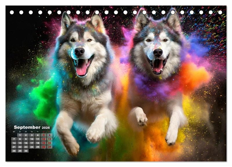 September: Zwei Alaskan Malamute springen in einer bunten Holi Pulver Farbwolke