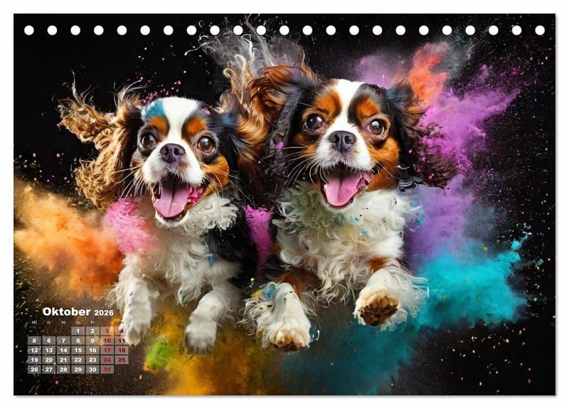 Oktober: Zwei Cavalier King Charles Spaniel springen in einer bunten Holi Pulver Farbwolke