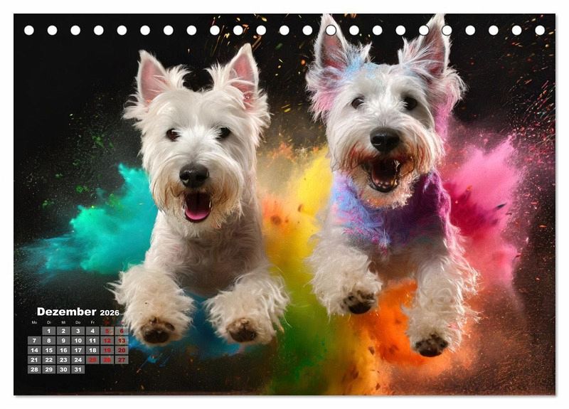 Dezember: Zwei West Highland Terrier springen in einer bunten Holi Pulver Farbwolke