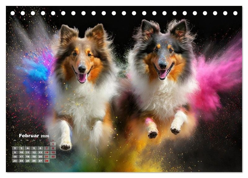 Februar: Zwei Shetland Sheepdog springen in einer bunten Holi Pulver Farbwolke