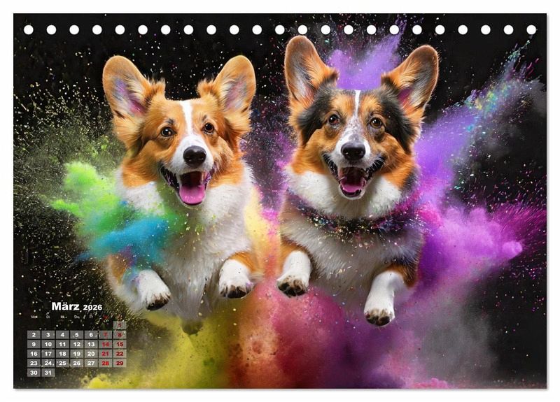 März: Zwei Welsh Corgi Pembroke springen in einer bunten Holi Pulver Farbwolke