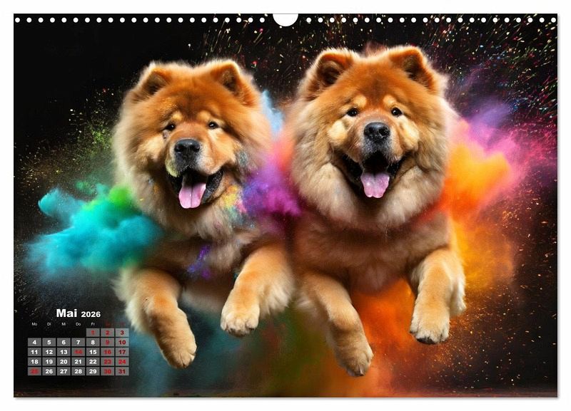 Mai: Zwei Chow Chow springen in einer bunten Holi Pulver Farbwolke