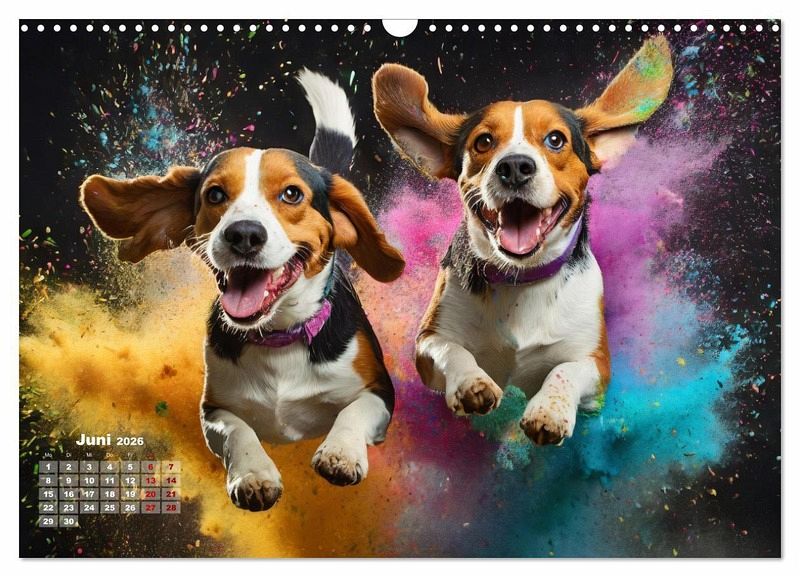 Juni: Zwei Beagle springen in einer bunten Holi Pulver Farbwolke