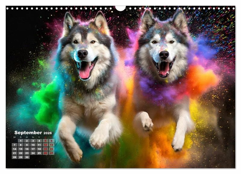 September: Zwei Alaskan Malamute springen in einer bunten Holi Pulver Farbwolke