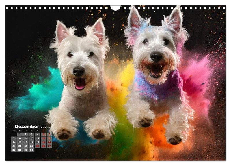 Dezember: Zwei West Highland Terrier springen in einer bunten Holi Pulver Farbwolke
