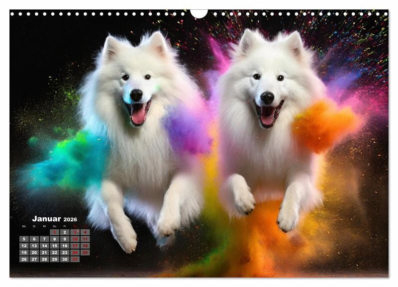 Januar: Zwei Samojeden springen in einer bunten Holi Pulver Farbwolke