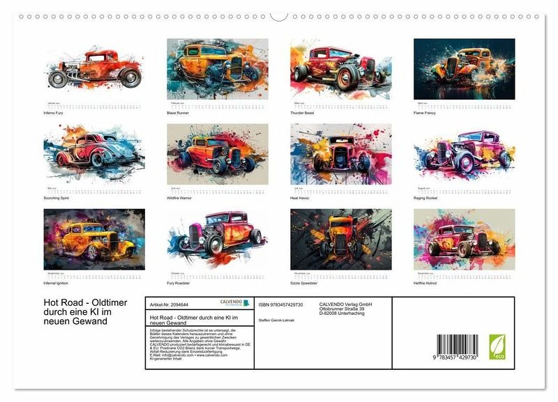Entdecken Sie die wilde Seite der Straße mit unseren legendären Hot Road Oldtimern! Diese kraftvollen Symbole der Freiheit verkörpern das ultimative Fahrerlebnis, das Adrenalin pur verspricht. Mit ihren markanten Designs und donnernden Motoren fesseln unsere Hot Rods die Blicke und lassen Herzen höher schlagen. Jedes Fahrzeug ist ein einzigartiges Meisterwerk, das die unverwechselbare Kombination aus Nostalgie und unbändiger Kraft verkörpert. Alle hier gezeigten Bilder wurden mit Sorgfalt, Liebe und mit Hilfe einer KI generiert. Abschließend werden sie mit Bildbearbeitungsprogrammen überarbeitet und in den Kalender eingefügt.