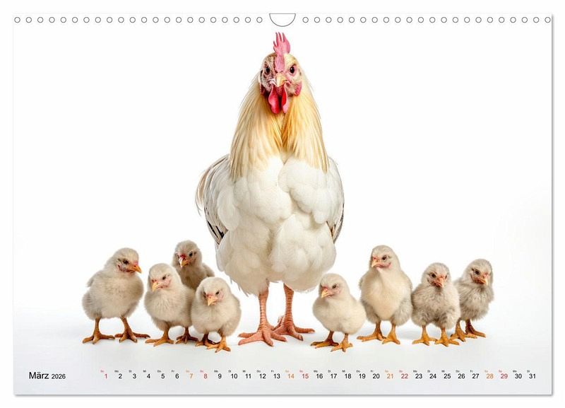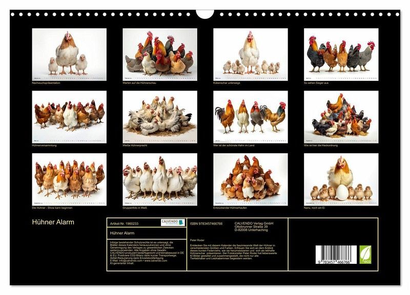 Entdecken Sie mit diesem Kalender die faszinierende Welt der Hühner in verschiedensten Größen und Farben. Erfreuen Sie sich an dem Anblick dieses bunten Federviehs, wie sie herumstolzieren und sich als lebhafte Hühnerschar präsentieren. Der Fotokünstler Peter Roder hat liebenswerte KI-Bilder gestaltet und zusammengestellt, die nicht nur alle Tierliebhaber und Liebhaberinnen begeistern werden.