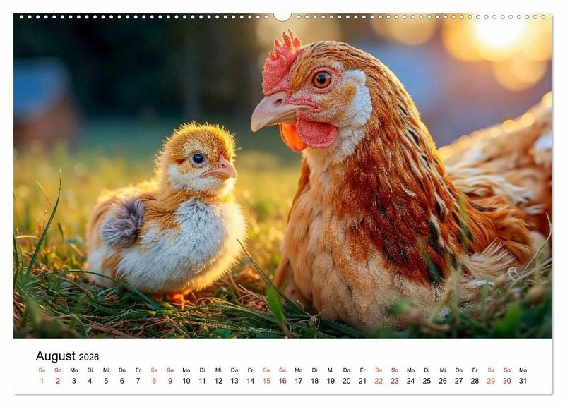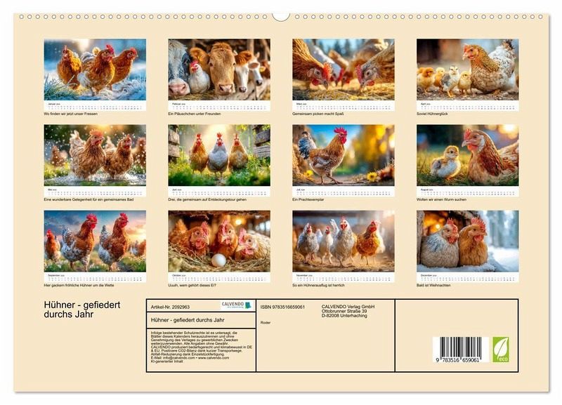 Erleben Sie die heitere Welt glücklicher Hühner, die ihr Leben in vollen Zügen genießen - frei und unbeschwert auf dem Bauernhof. Monat für Monat begleiten Sie diese charmanten Gefiederten durch die Jahreszeiten. Ob fröhliche Küken-Ausflüge über den Hof oder ein neugieriges Huhn beim Plausch mit den Kühen im Stall. Im Sonnenschein, Regen und auch Schnee ist dieses bunte Federvieh quietschvergnügt unterwegs. Gestaltet mit dem Auge fürs Detail sind diese Bilder ein herzerwärmender Blick auf das einfache Glück, wobei die grafische Umsetzung im Zusammenspiel klassischer Gestaltung und ausgewählter KI-basierter Methoden erfolgte. Ein perfektes Geschenk für alle Tierfreunde, Naturgenießer und Landliebhaber.