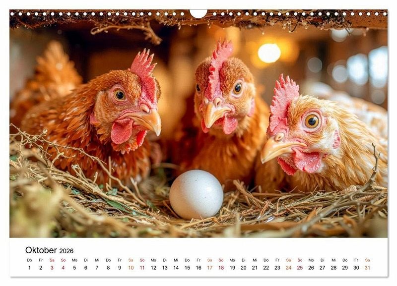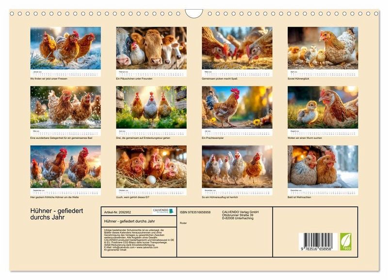 Erleben Sie die heitere Welt glücklicher Hühner, die ihr Leben in vollen Zügen genießen - frei und unbeschwert auf dem Bauernhof. Monat für Monat begleiten Sie diese charmanten Gefiederten durch die Jahreszeiten. Ob fröhliche Küken-Ausflüge über den Hof oder ein neugieriges Huhn beim Plausch mit den Kühen im Stall. Im Sonnenschein, Regen und auch Schnee ist dieses bunte Federvieh quietschvergnügt unterwegs. Gestaltet mit dem Auge fürs Detail sind diese Bilder ein herzerwärmender Blick auf das einfache Glück, wobei die grafische Umsetzung im Zusammenspiel klassischer Gestaltung und ausgewählter KI-basierter Methoden erfolgte. Ein perfektes Geschenk für alle Tierfreunde, Naturgenießer und Landliebhaber.