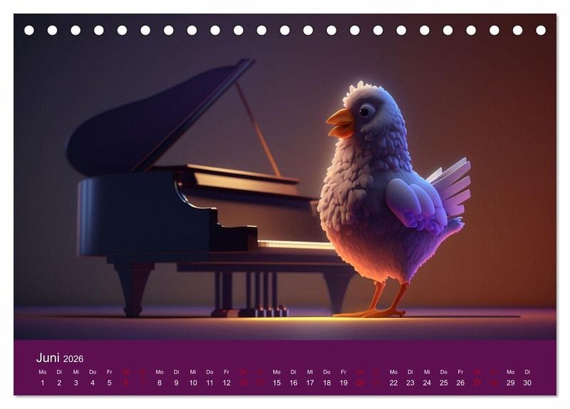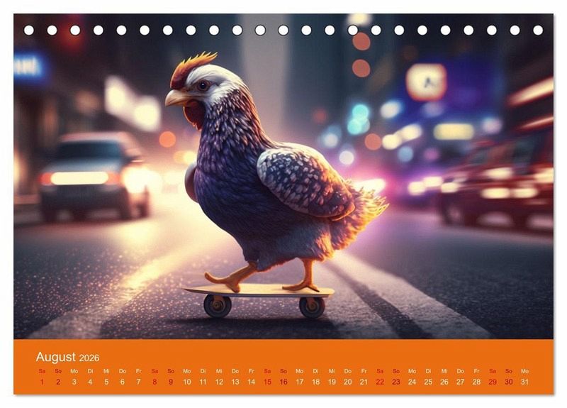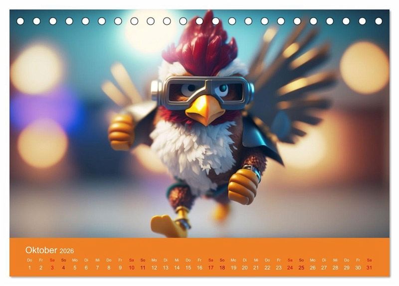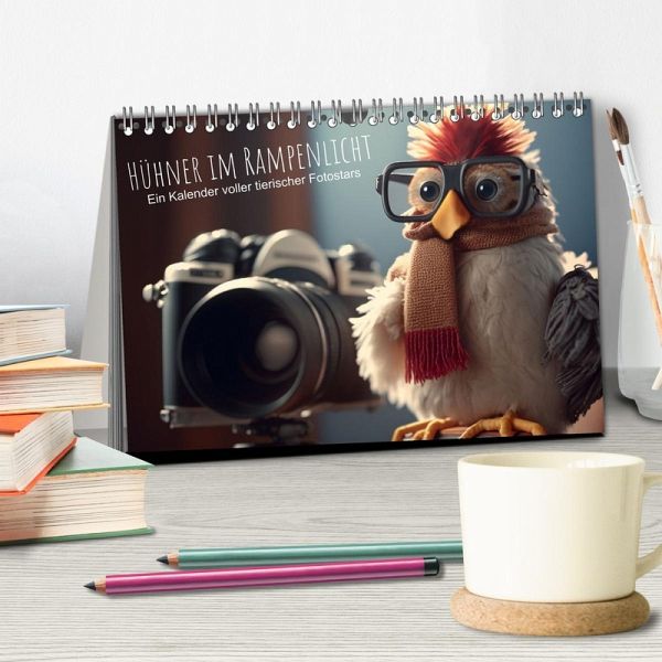 Machen Sie Platz im Hühnerstall für unseren neuen Kalender! Freuen Sie sich auf zwölf Monate voller Hühneraction und tierischer Unterhaltung. Ob als Superhelden, Rockstars oder Sportler - diese Federtier Illustrationen haben das Rampenlicht erobert und garantieren Ihnen gute Laune. Sichern Sie sich jetzt diesen witzigen Hühnerkalender und lassen Sie sich von den lustigen KI Illustrationen begeistern!