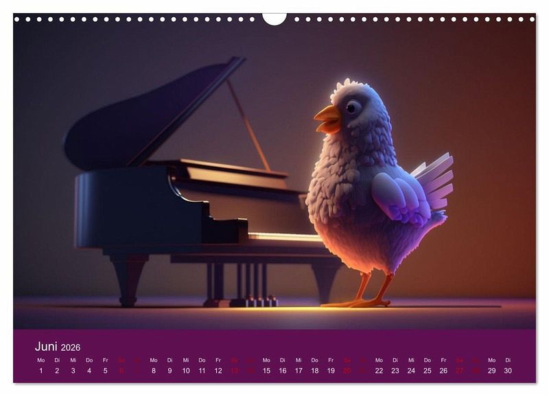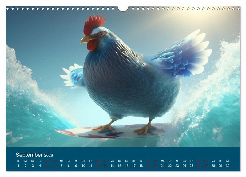 Machen Sie Platz im Hühnerstall für unseren neuen Kalender! Freuen Sie sich auf zwölf Monate voller Hühneraction und tierischer Unterhaltung. Ob als Superhelden, Rockstars oder Sportler - diese Federtier Illustrationen haben das Rampenlicht erobert und garantieren Ihnen gute Laune. Sichern Sie sich jetzt diesen witzigen Hühnerkalender und lassen Sie sich von den lustigen KI Illustrationen begeistern!
