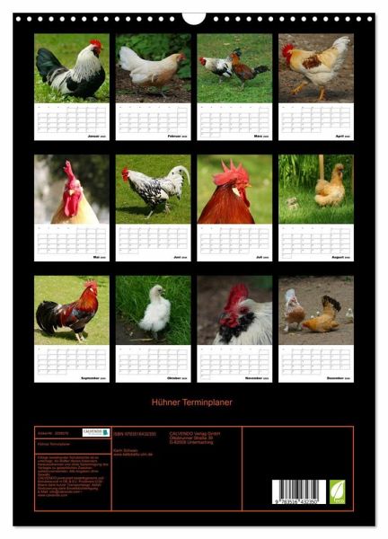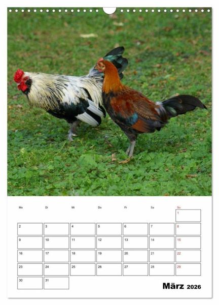 Hühner sind als Nutztiere die wichtigsten Eierlieferanten. Aber auch Liebhaber halten Zierhühner in den unterschiedlichsten Farben und Formen. Dieses kunterbunte Federvieh soll Sie durchs Jahr begleiten und Ihnen dabei helfen an wichtige Termine zu denken.