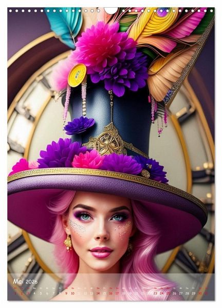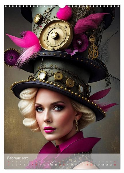 Februar: Blonde Frau trägt dunklen Hut mit Zahnrädern und Blüten und pink lila Federn