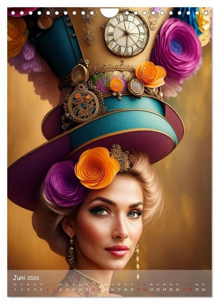 Juni: Ein grüner Hut mit Blüten, Zahnrädern, einer Uhr, getragen von einer blonden Frau