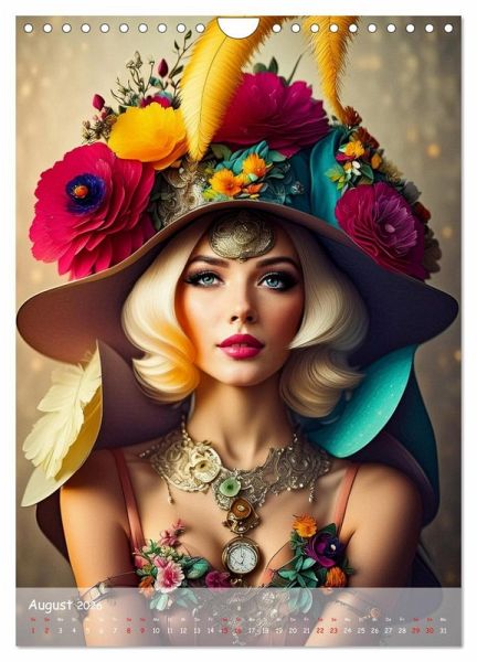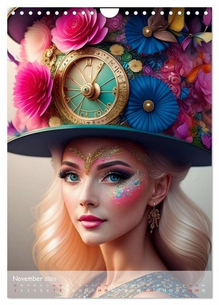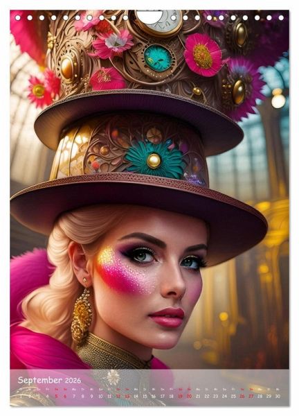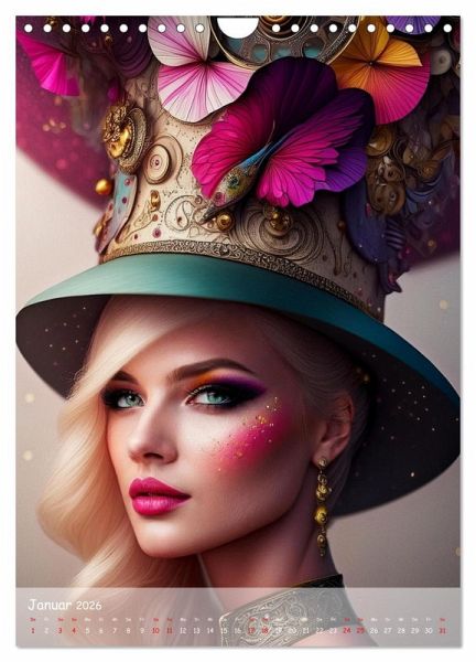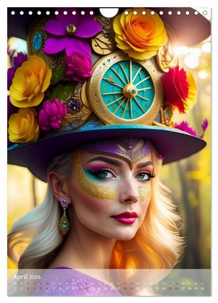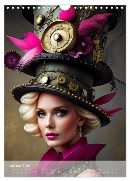 Februar: Blonde Frau trägt dunklen Hut mit Zahnrädern und Blüten und pink lila Federn