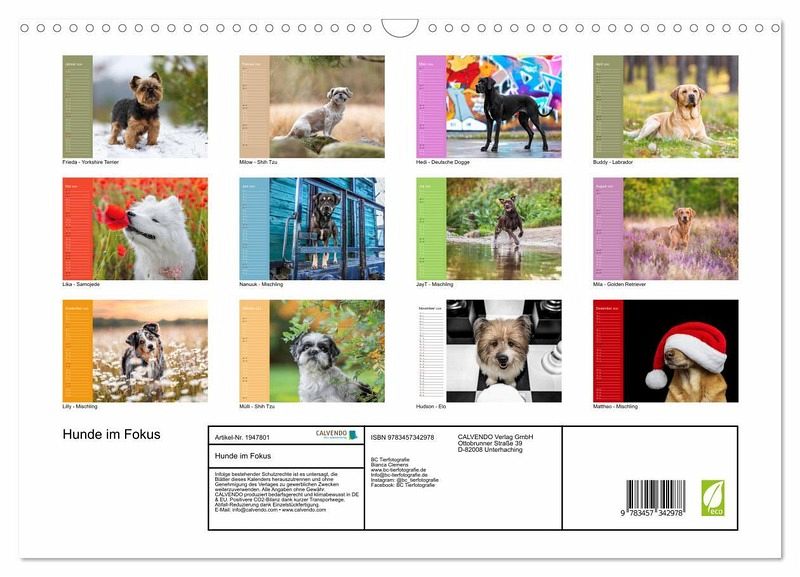 QUALITÄT - Hochwertiger Fotokalender mit 12 wunderschönen Motiven auf lichtbeständigem Bilderdruckpapier, robuste Spiralbindung mit Aufhängebügel.NACHHALTIG - deutliche Abfallreduzierung durch bedarfsgerechte Einzelstückfertigung, umweltfreundliches FSC-zertifiziertes Papier, Produktion in Deutschland, klimabewusste Logistik.PERFEKTES GESCHENK - Kalender für Freunde und Familie, für Kinder und Erwachsene, jung und alt, zu Weihnachten, Geburtstag oder zwischendurch.VIELFALT - Bildkalender in verschiedenen Formaten, z.B. DIN A5, DIN A4, DIN A3 sowie DIN A2. Ob Naturmotiv, Gemälde oder Fotos, ideal für ein persönliches Wohlfühlambiente.Die Vielfalt der Hunde(rassen) im Fokus. von Autor(in): Bianca Clemens