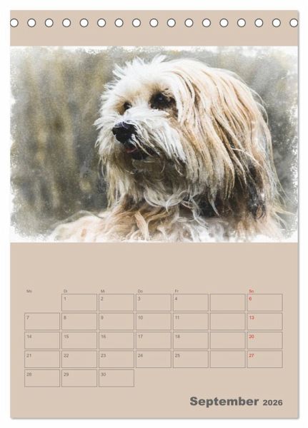 13 verschiedene, zum Aquarell weiterbearbeitete, Hundeportraits erfreuen Sie das ganze Jahr hindurch. Quer durch alle Rassen haben hier die verschiedensten Hunde Ihren Platz im Kalender gefunden...von den ganz Kleinen, wie Havaneser oder Beagle über die Mittleren, wie Collie und Magyar Vizsla bis hin zu den ganz Großen, wie Briard und Mastin Espanol. Alle Bilde haben dabei eins gemeinsam... sie zeigen unsere geliebten Fellnasen, als ganz besonderen Blickfang. Machen Sie sich oder einem lieben Hundefreund ein tolles Geschenk mit diesem außergewöhnlichen Kalender.