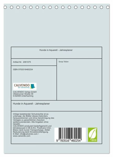 QUALITÄT - Hochwertiger Fotokalender mit 12 wunderschönen Motiven auf lichtbeständigem Bilderdruckpapier, robuste Spiralbindung.NACHHALTIG - deutliche Abfallreduzierung durch bedarfsgerechte Einzelstückfertigung, umweltfreundliches FSC-zertifiziertes Papier, Produktion in Deutschland, klimabewusste Logistik.PERFEKTES GESCHENK - Kalender für Freunde und Familie, für Kinder und Erwachsene, jung und alt, zu Weihnachten, Geburtstag oder zwischendurch.VIELFALT - Bildkalender in verschiedenen Formaten, z.B. DIN A5, DIN A4, DIN A3 sowie DIN A2. Ob Naturmotiv, Gemälde oder Fotos, ideal für ein persönliches Wohlfühlambiente.Hundeportraits der unterschiedlichsten Rassen, von der Fotografin Sonja Teßen aufgenommen und zum Aquarell weiterbearbeitet, begleiten Sie in Ihrem Jahresplaner. von Autor(in): Sonja Teßen